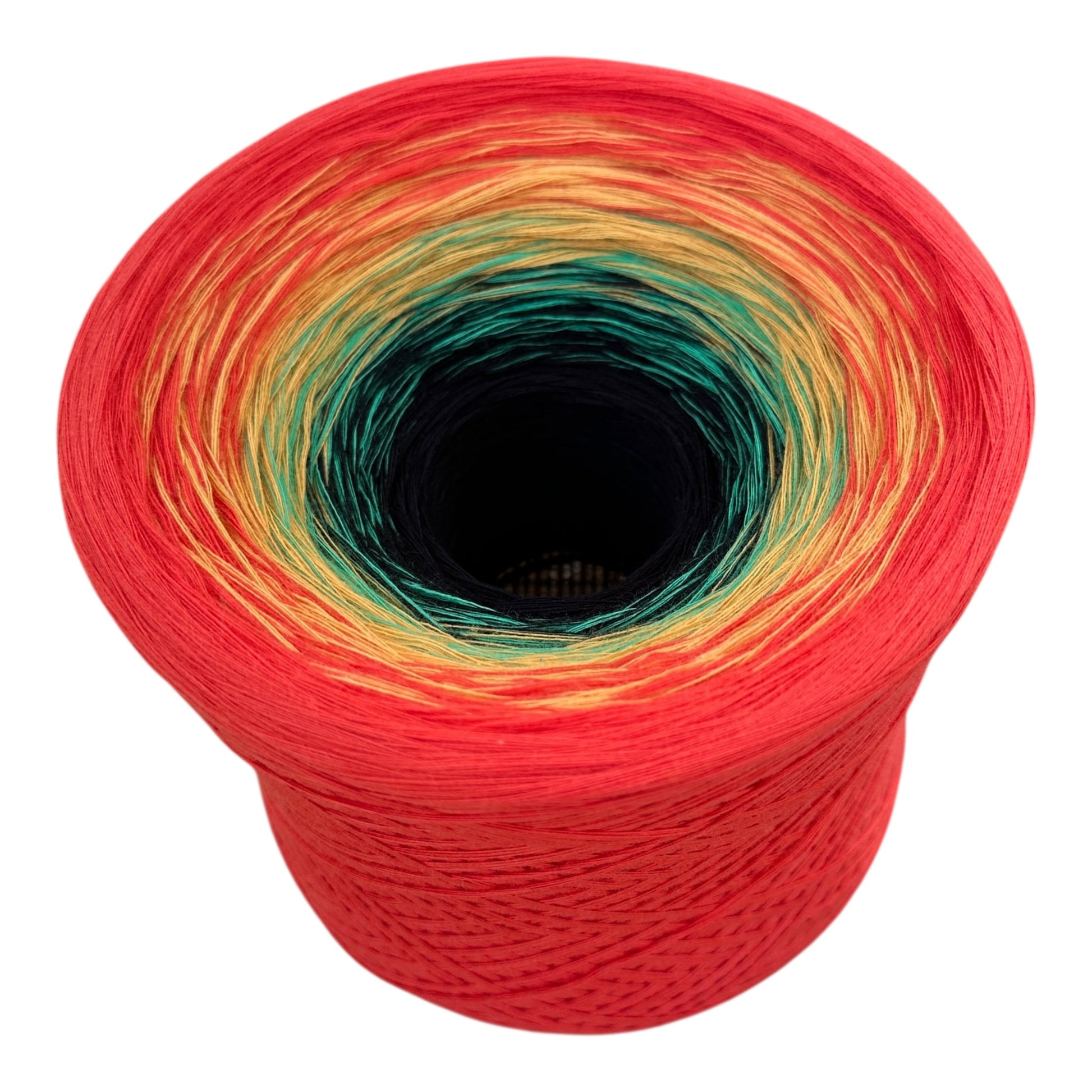 The yarn consist of 8 strands of cotton thread hand wound together and has long transitions for amazing color effect. It can be worked from inside or outside. The Vibrant gradients are created by the different strand colors ties together using tiny knots that do not need extra work to be used in your project.