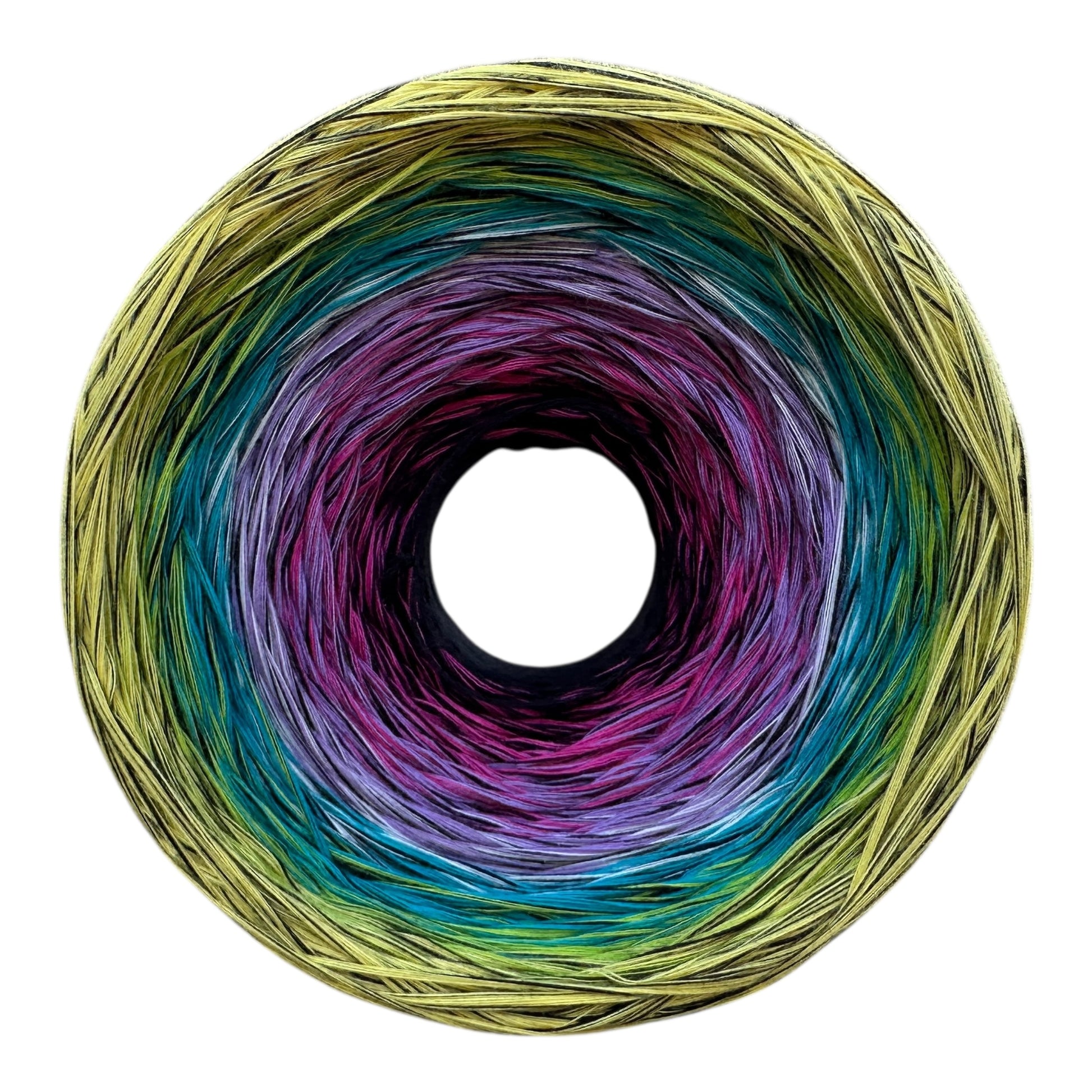 The yarn consist of 8 strands of cotton thread hand wound together and has long transitions for amazing color effect. It can be worked from inside or outside. The Vibrant gradients are created by the different strand colors ties together using tiny knots that do not need extra work to be used in your project.